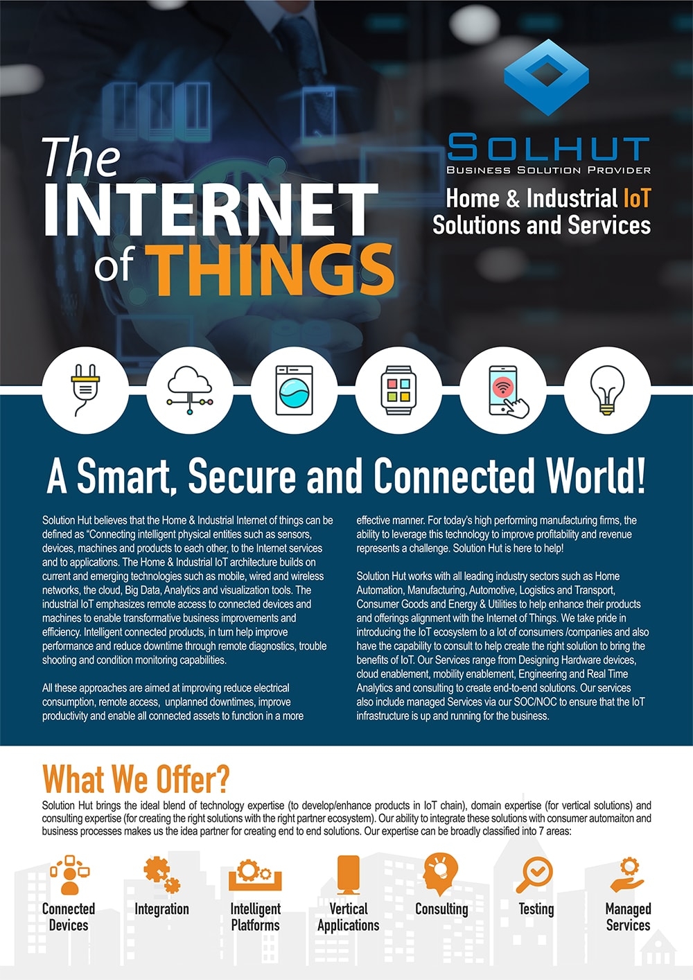 Solution Hut has developed its expertise in Internet of things (IoT). We specialize in providing turnkey solution, from Sensors integration, Mobile App, Cloud setup to Web applications. We have been working on multiple IoT projects to exchange information between the devices and central cloud server.
